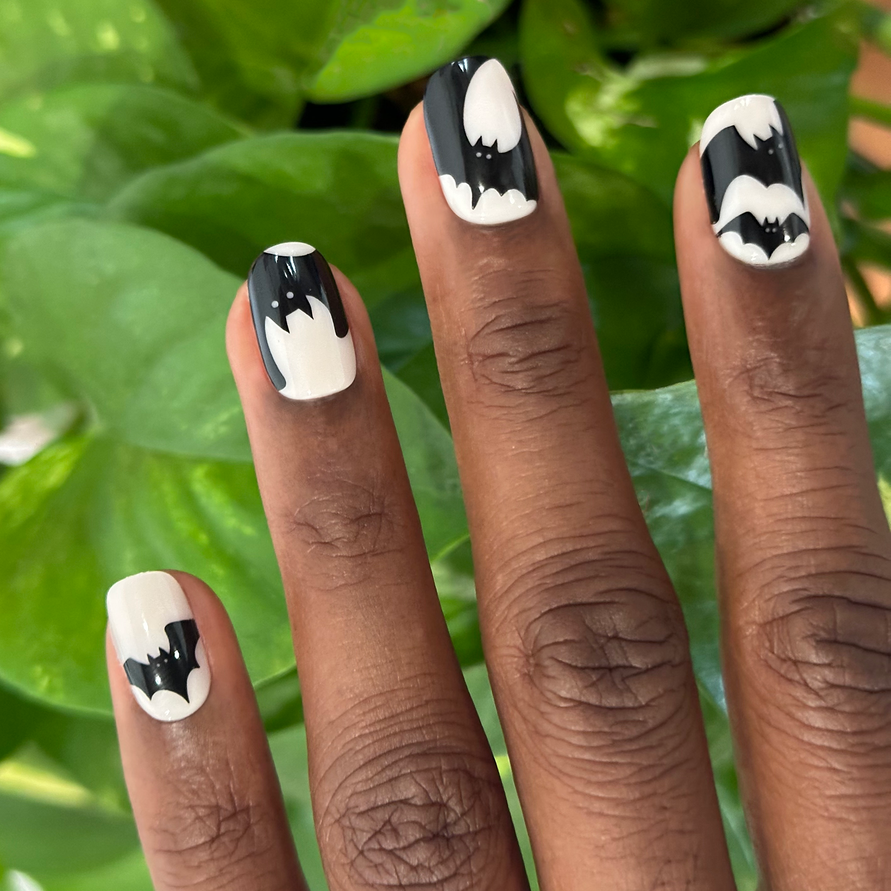 A neutral mani gets super scary with a party of bats in a short squoval shape.