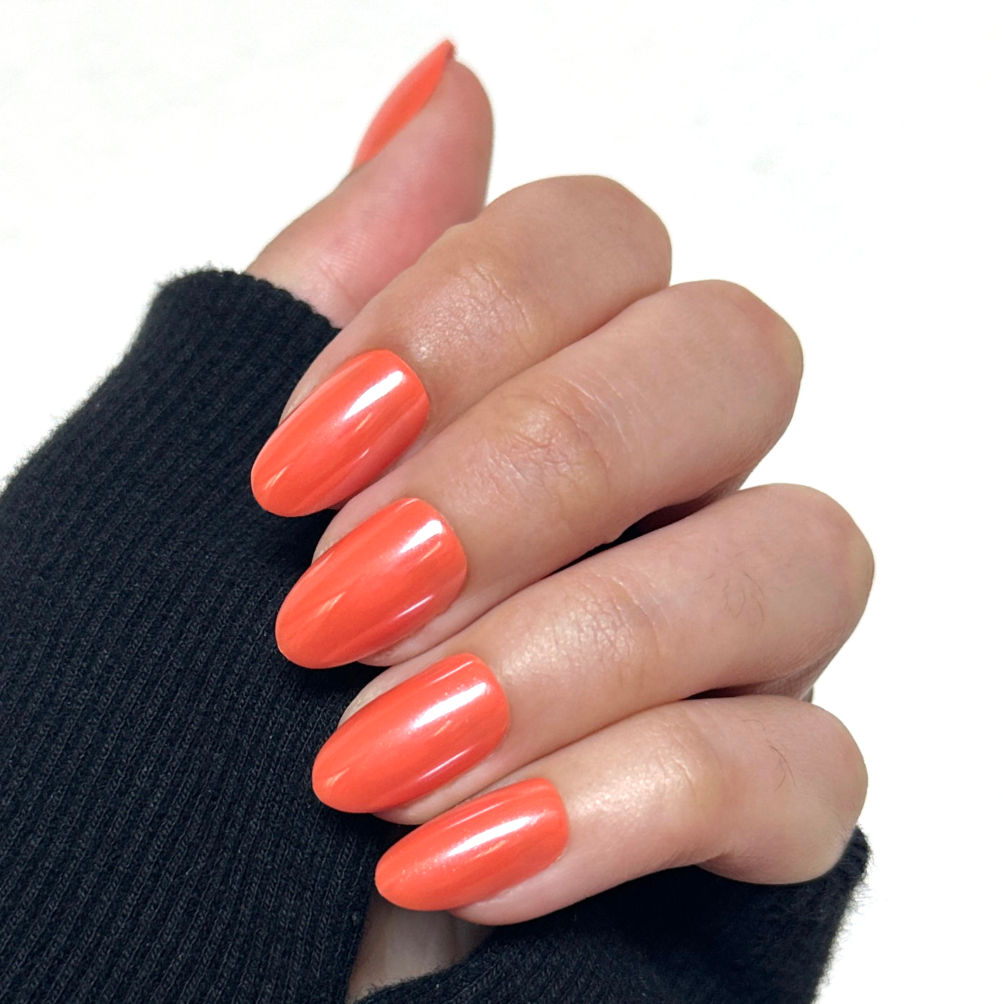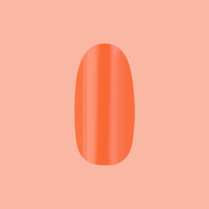 A bright tangerine orange mani topped with shimmery chrome in a medium oval shape.