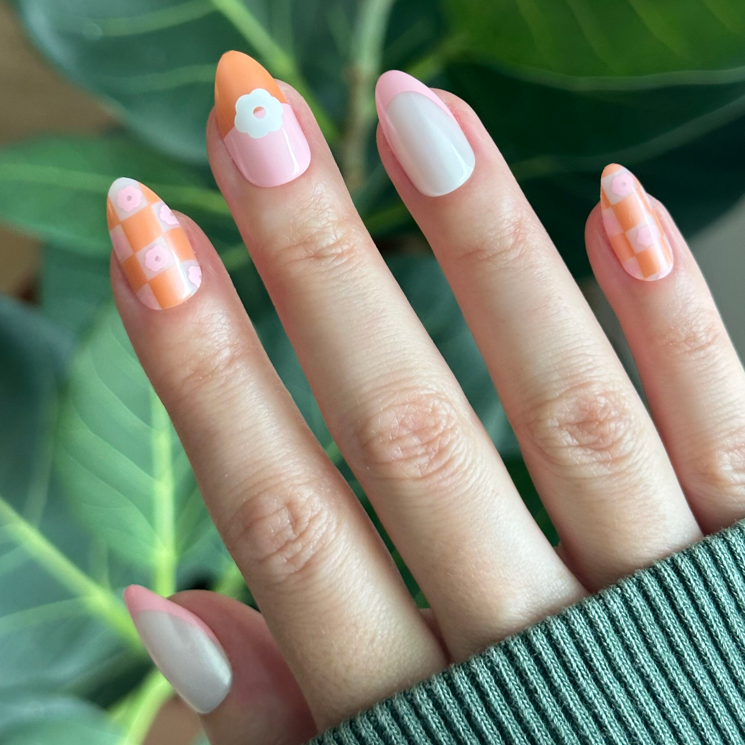 A fabulously floral mixed pack of frenches. prints and solids topped with chrome in a medium almond shape.