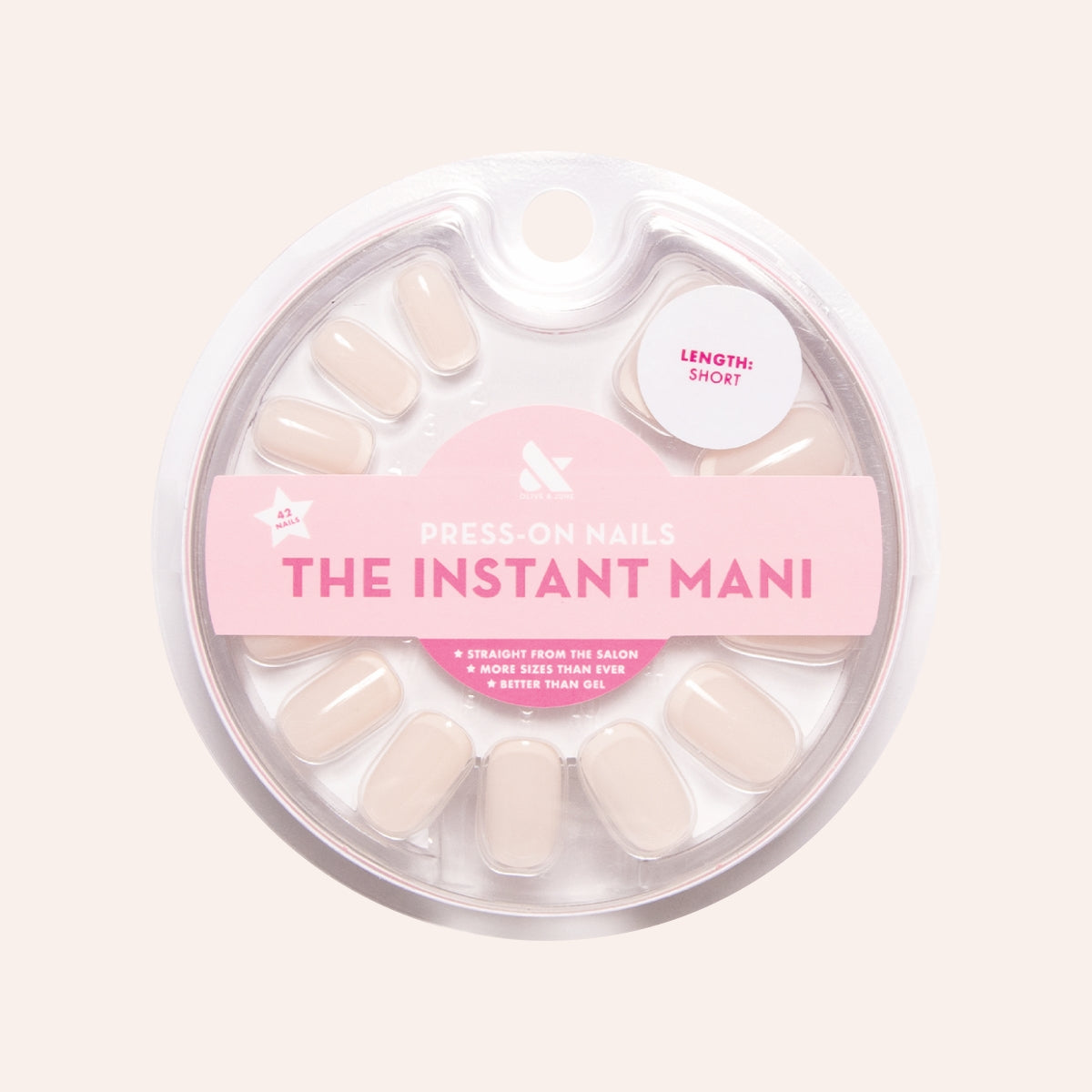 A short squoval classic french with a neutral peachy pink base and clean crisp white tip.