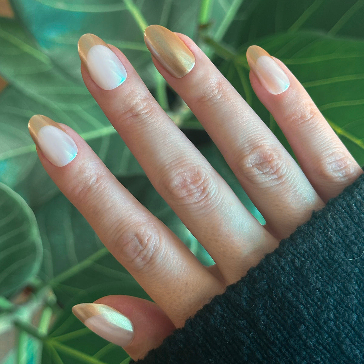 A mani set of solid glimmering gold and golden french tips in a medium oval shape.
