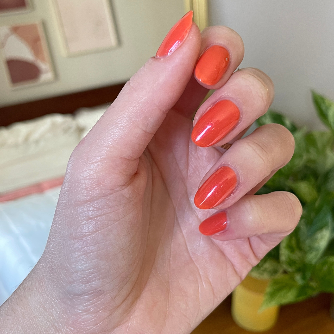 A sheer red-orange iridescent that practically fizzes with shimmer.