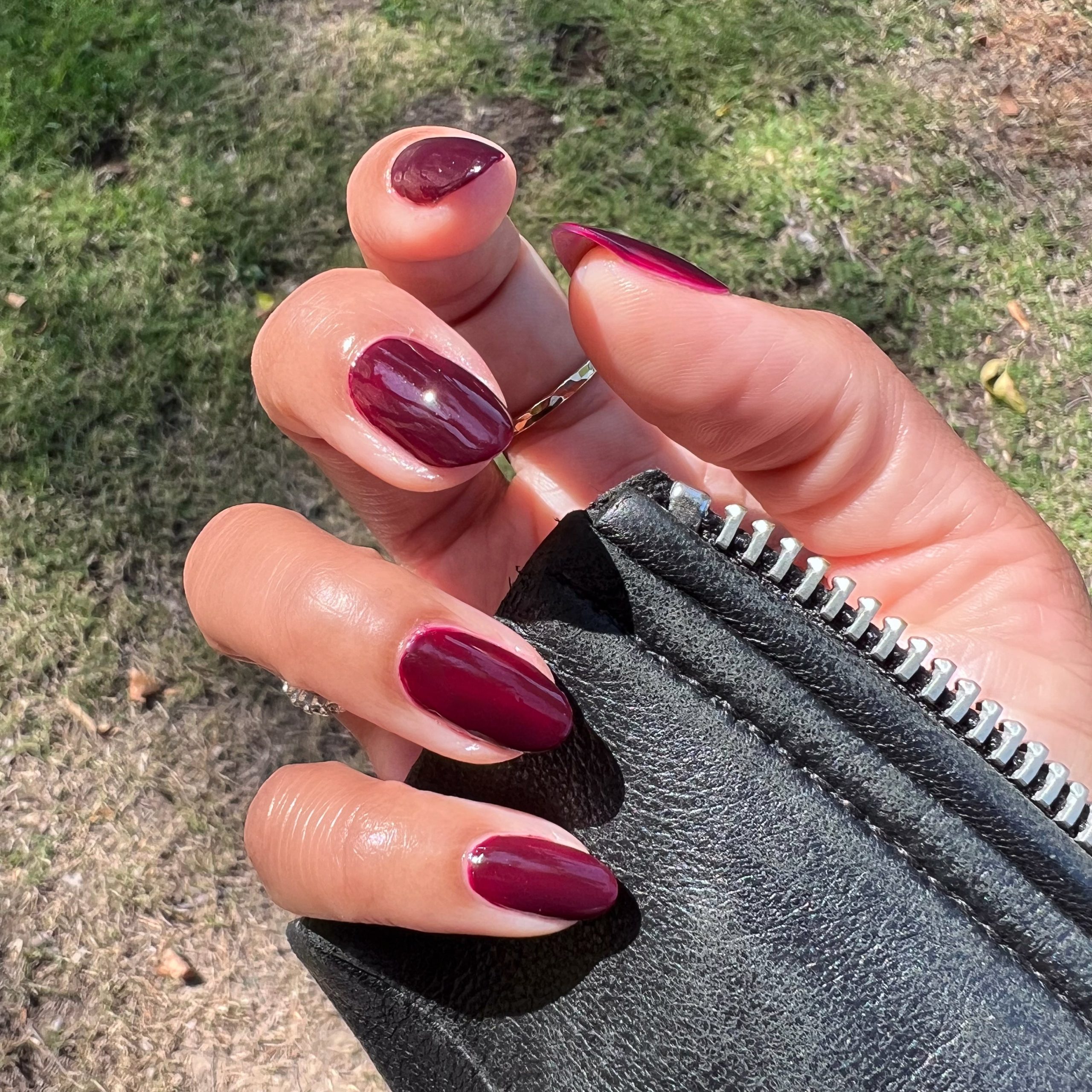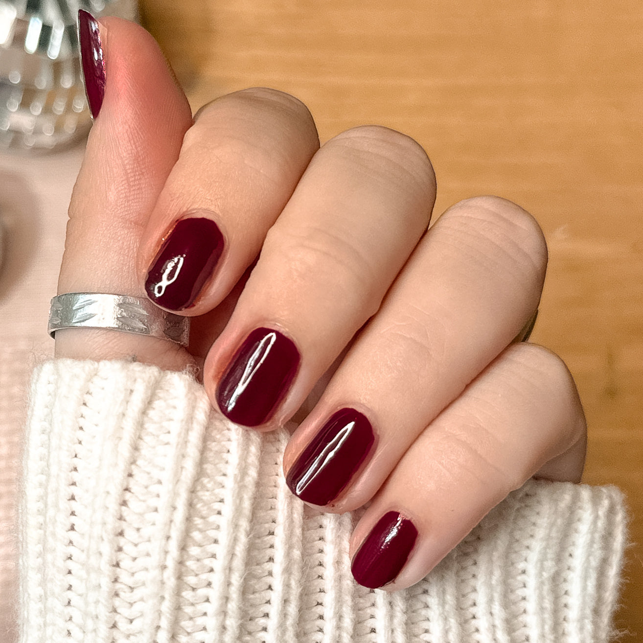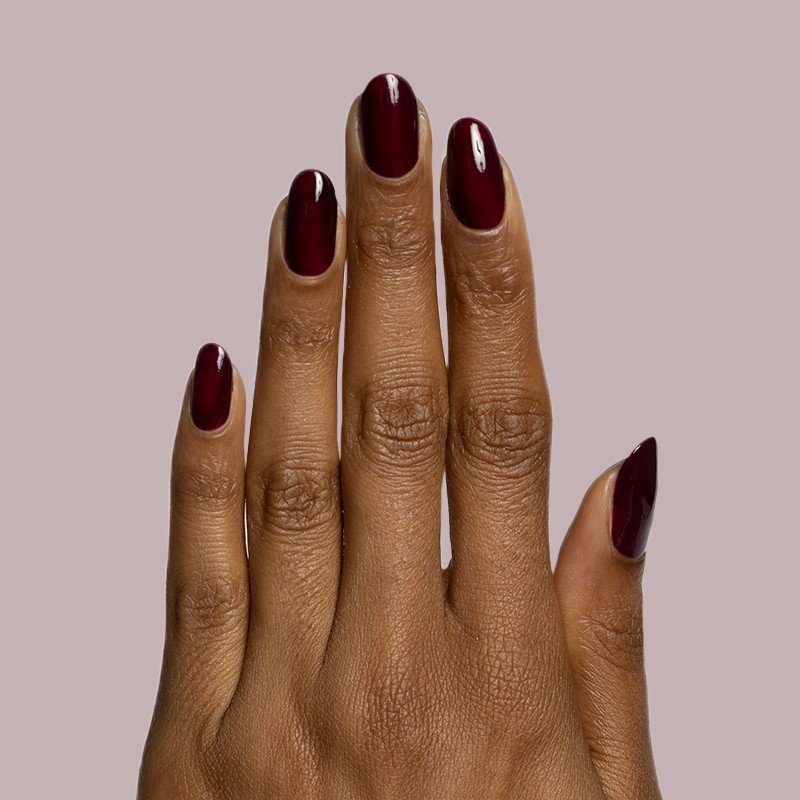A crimson jelly sheer for perfectly patent leather looking nails.