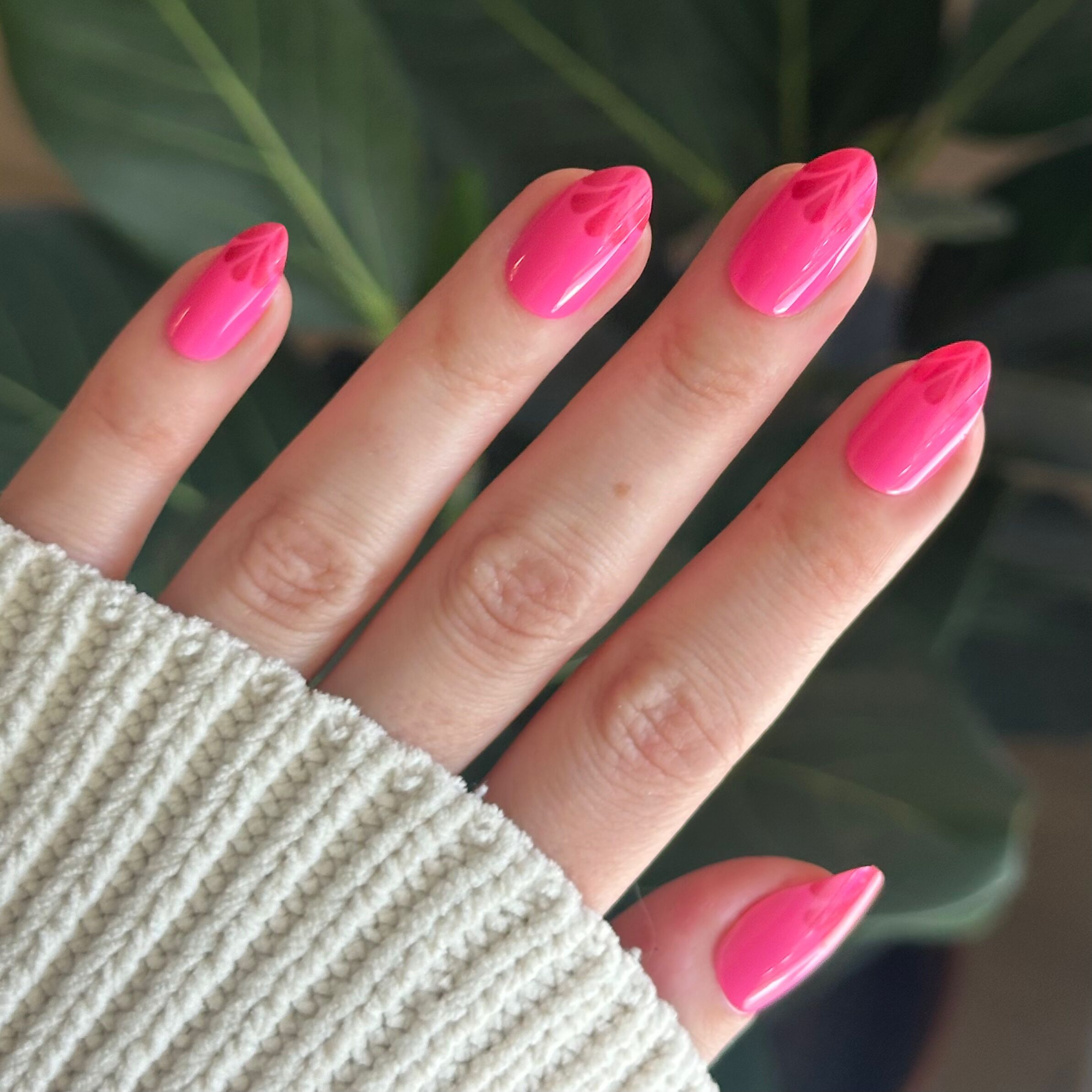 A tonal magenta pink mani with subtle chrome petal tips in a medium almond shape.