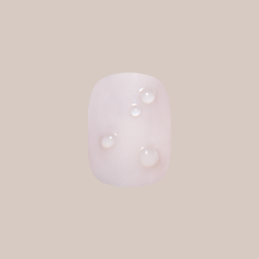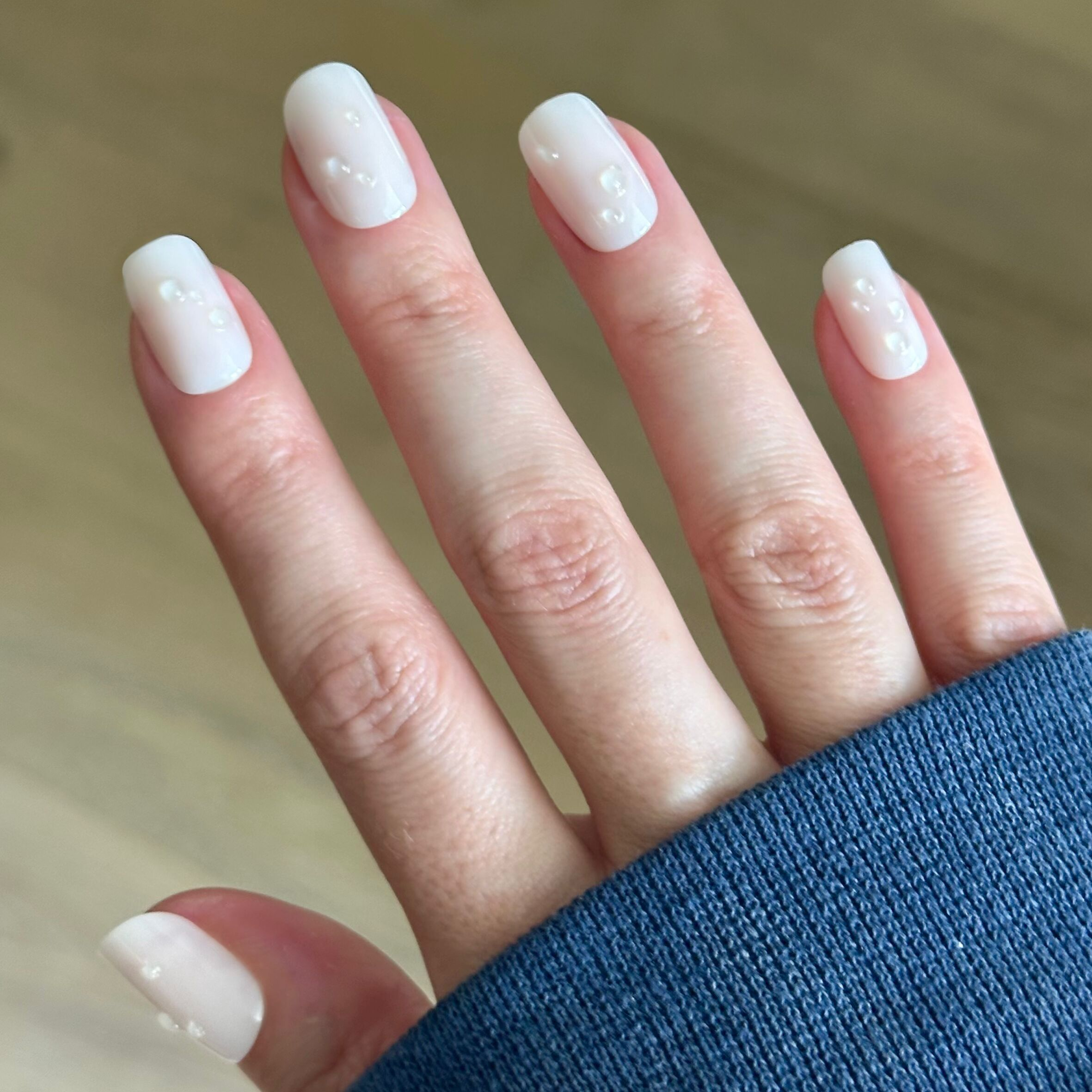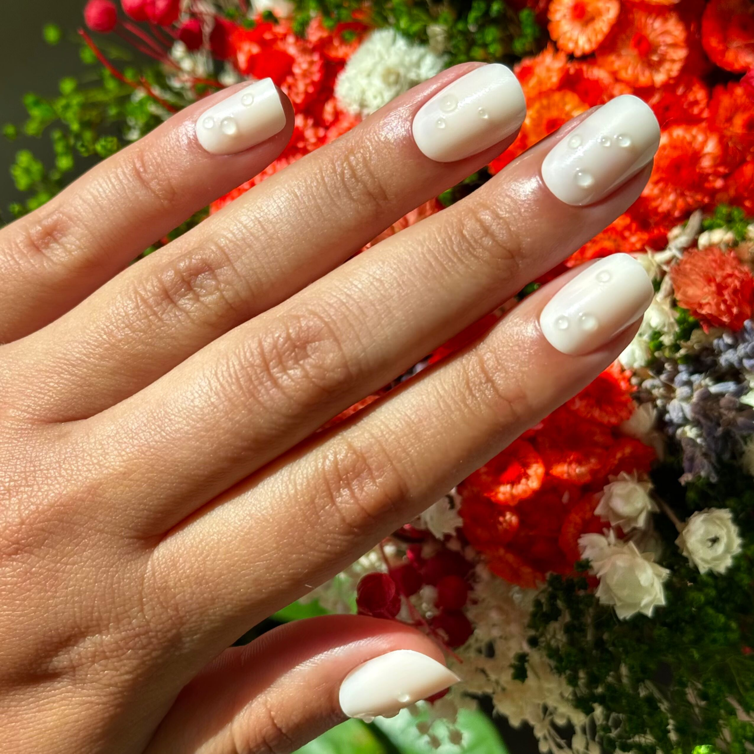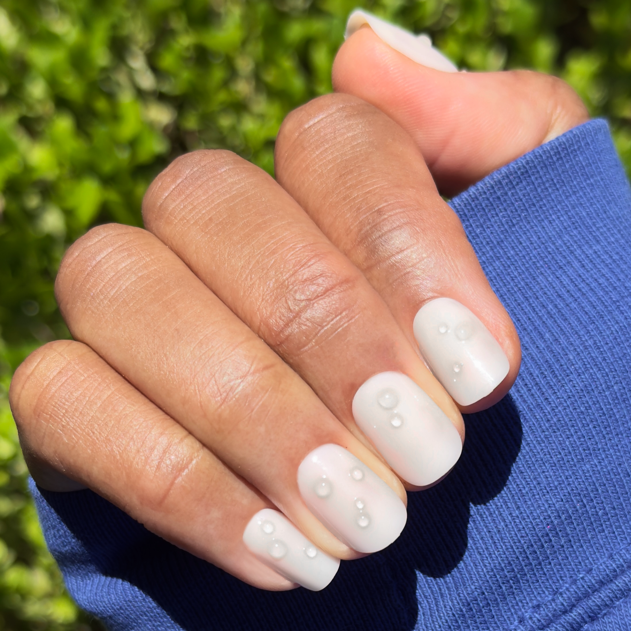 A milky sheer mani accented by 3D puffy bubbles in a short squoval shape.
