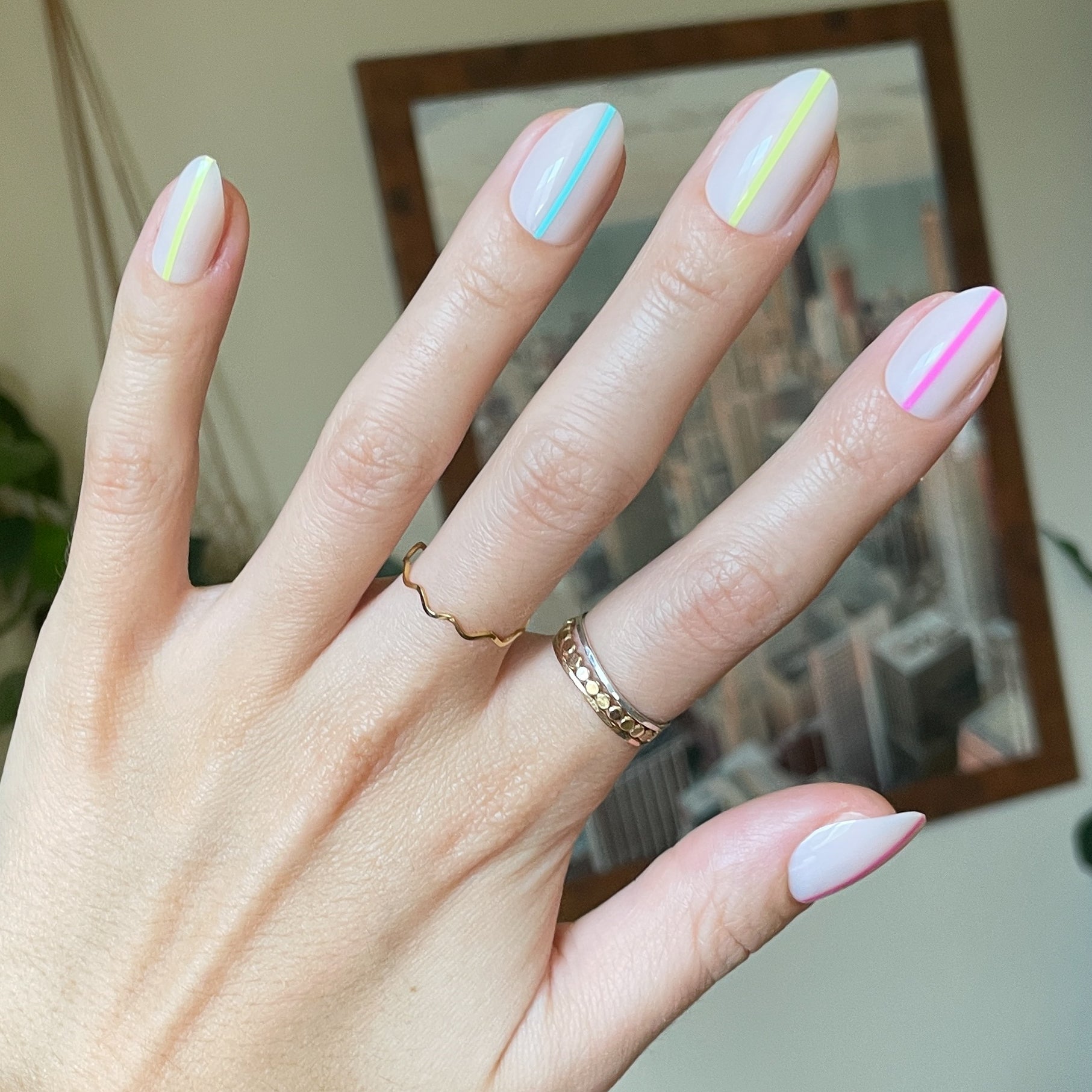 A neutral mani with pops of neon lines on a medium almond shape.
