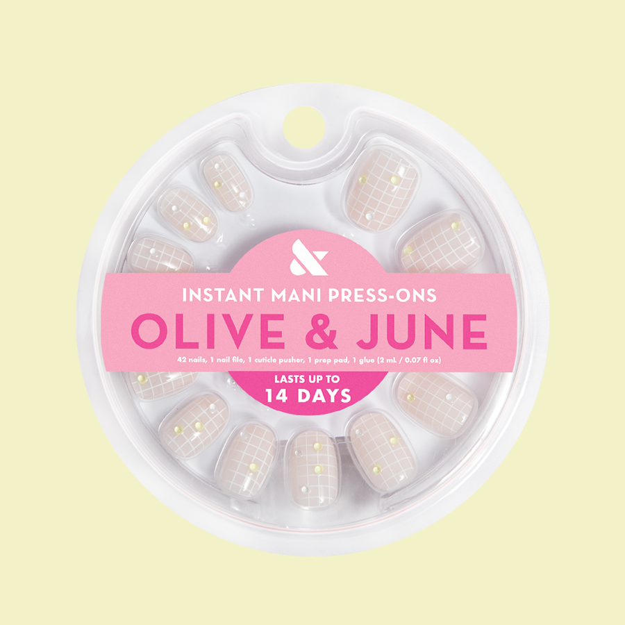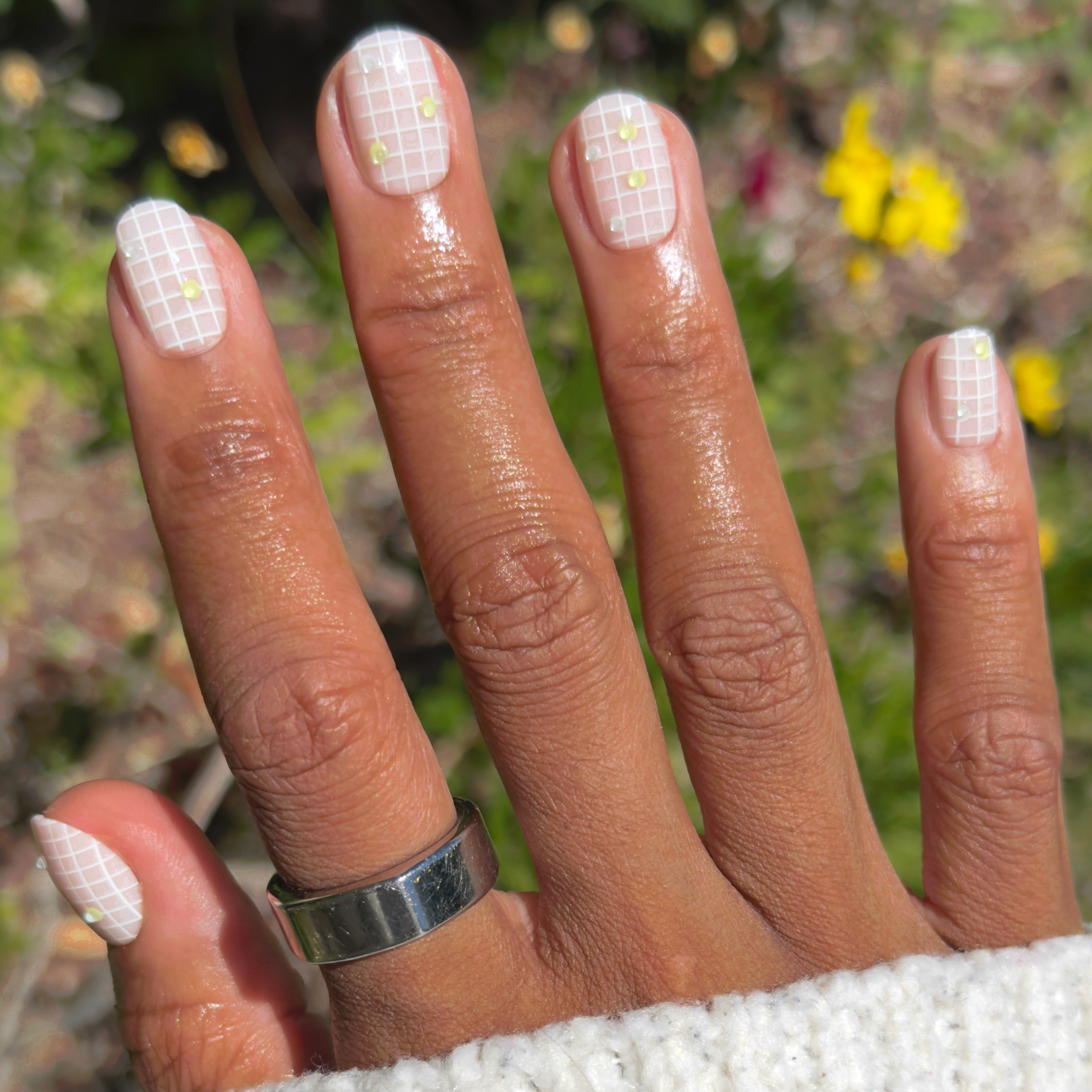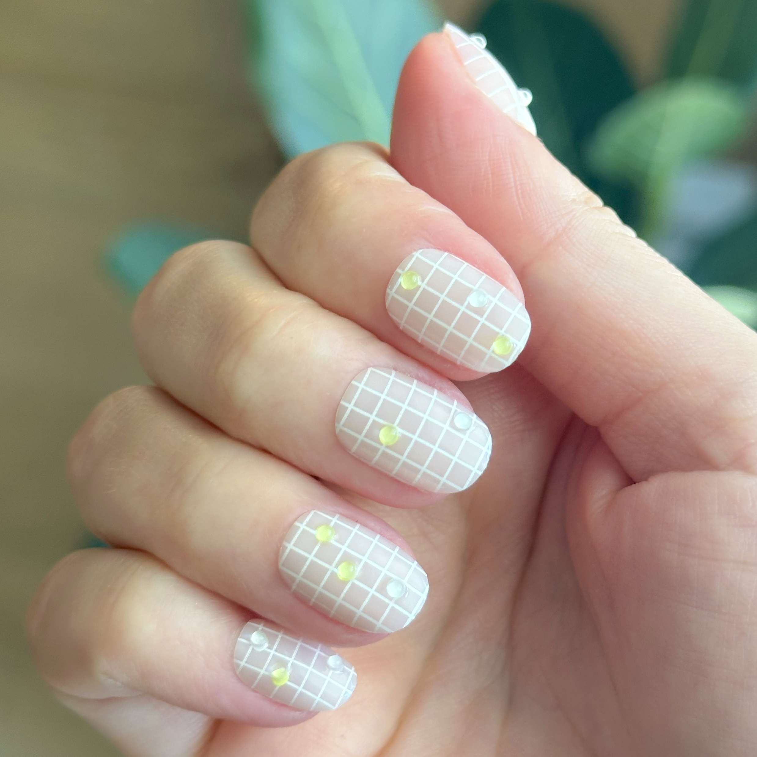 A neutral grid mani accented by tiny green tennis balls in an extra short round shape.