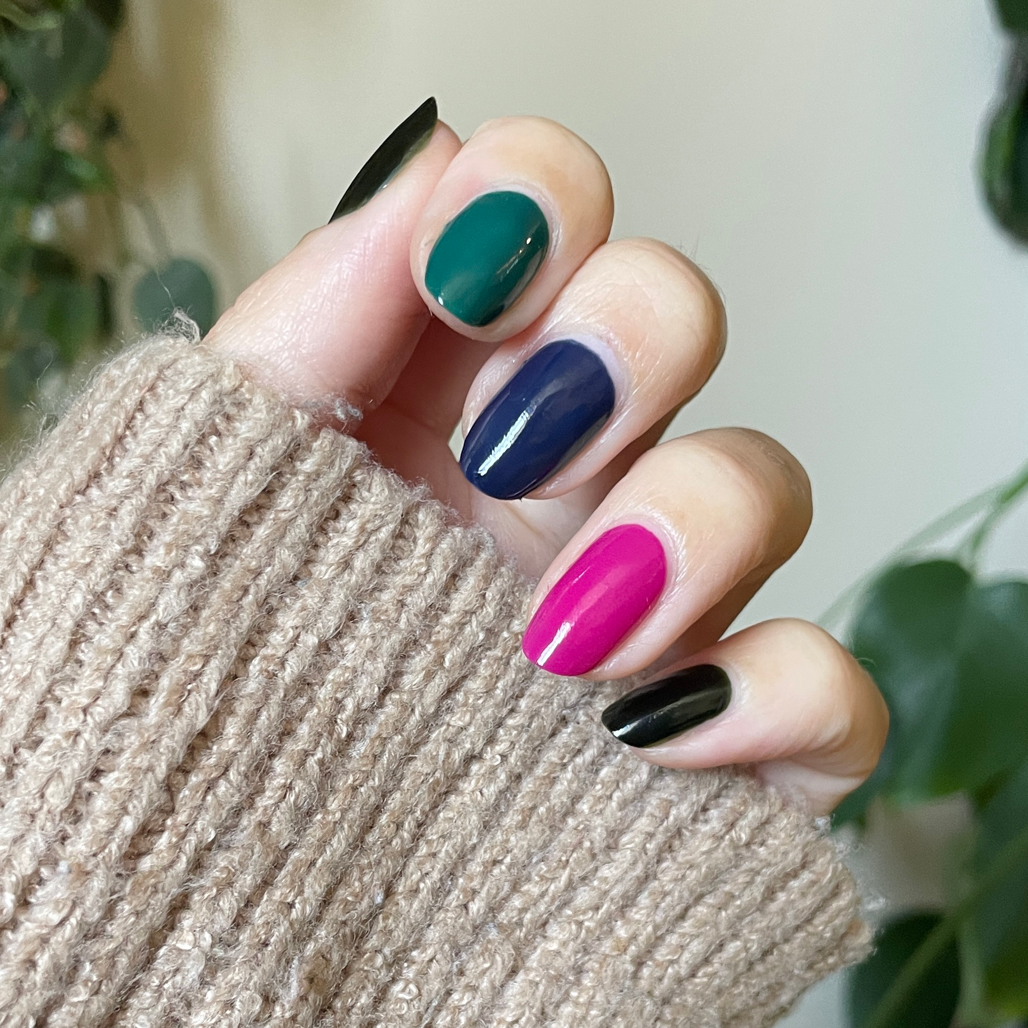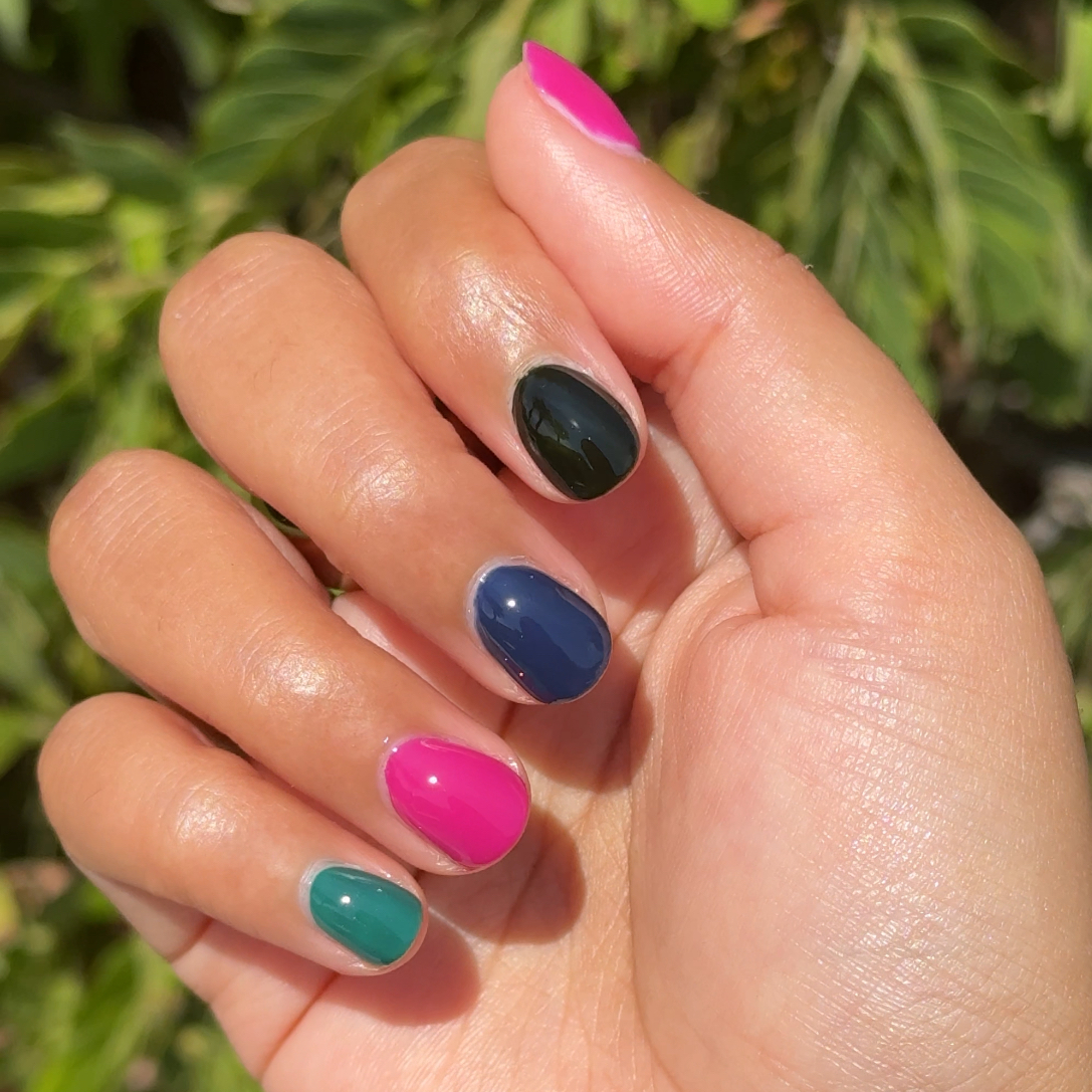 A colorful skittle manicure that’s all the fun of night out in one set! This set features a mix of brights and darks that capture the energy and hues of the best night ever.