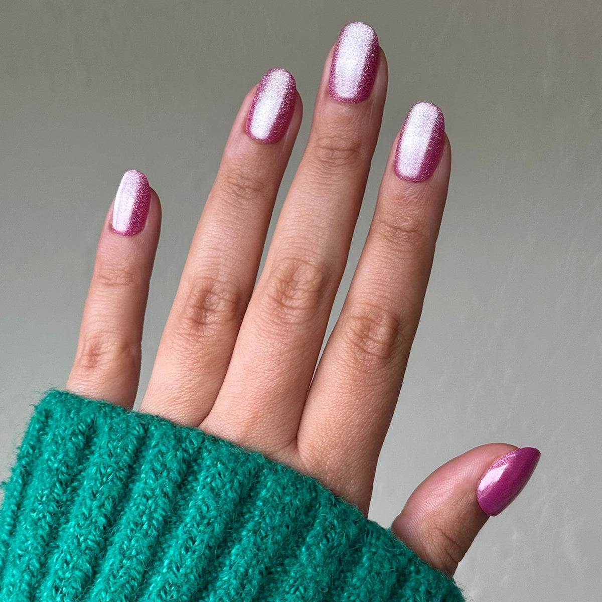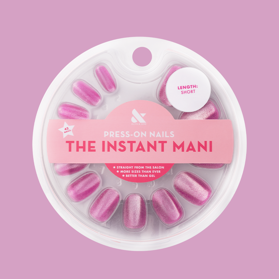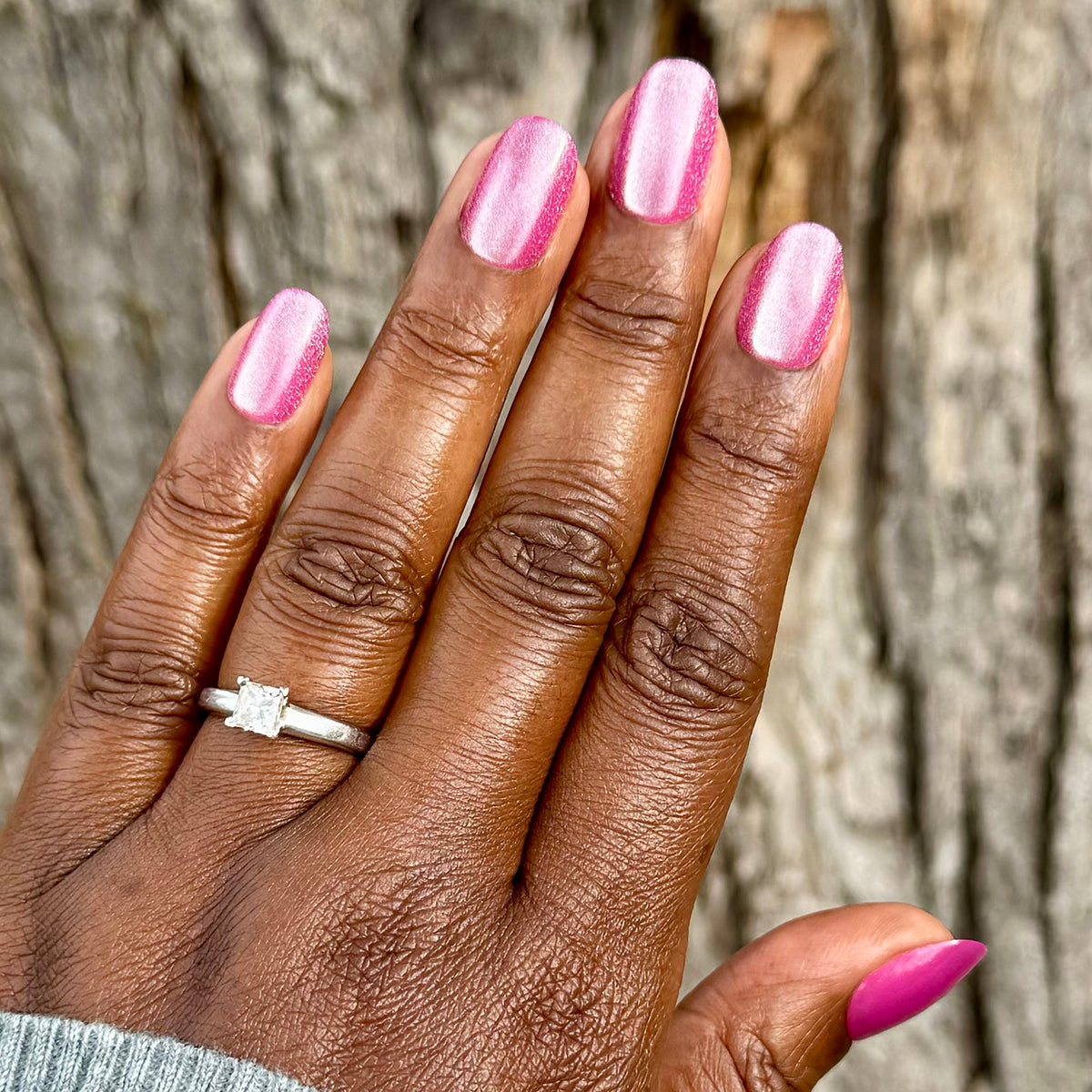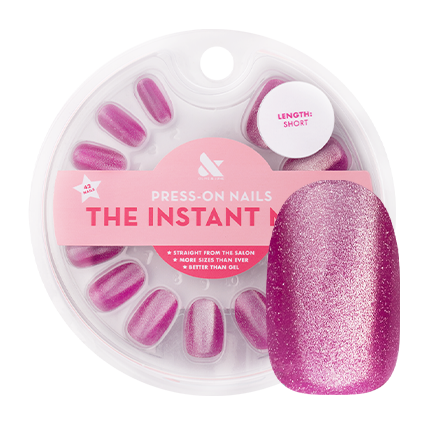 A sweet bright pink with a metallic velvet effect in a short round shape.