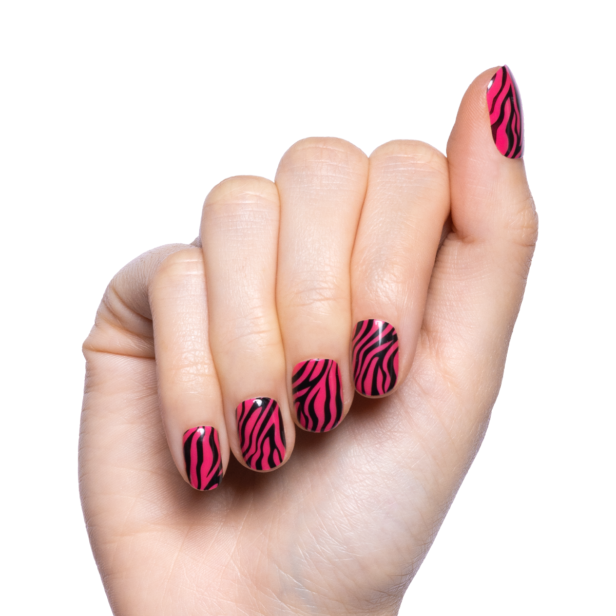 A hot pink zebra print mani in an extra short squoval shape.