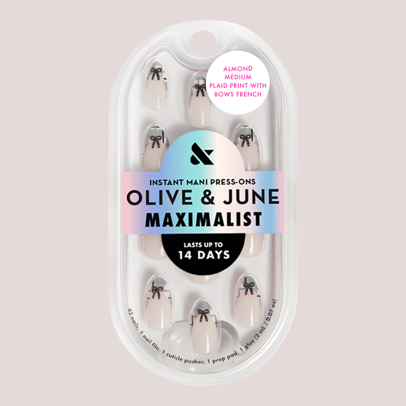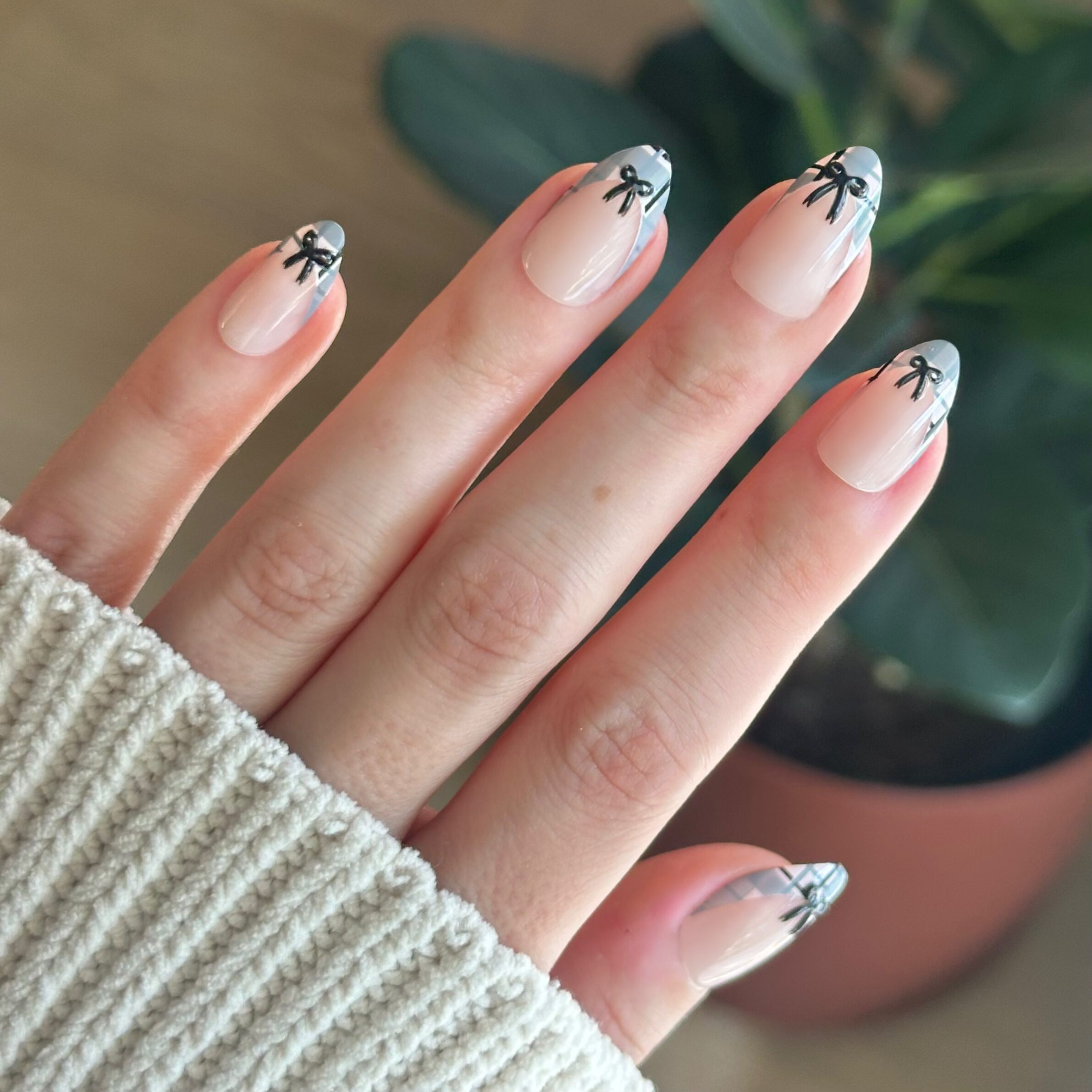 A neutral french mani with a grey plaid print tip with tiny black bows in a medium almond shape.