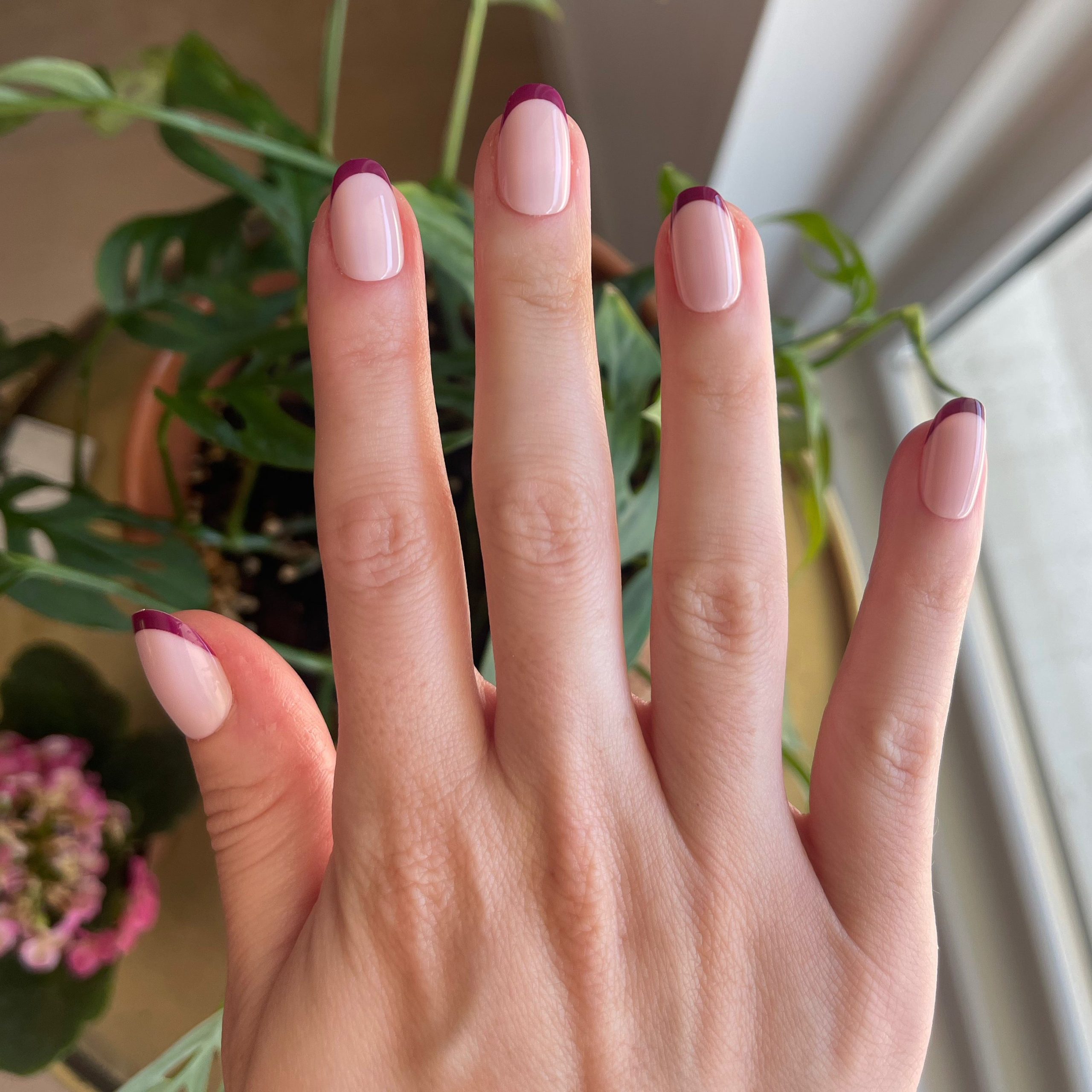 A plum french tip on a neutral pink base in a short round shape.