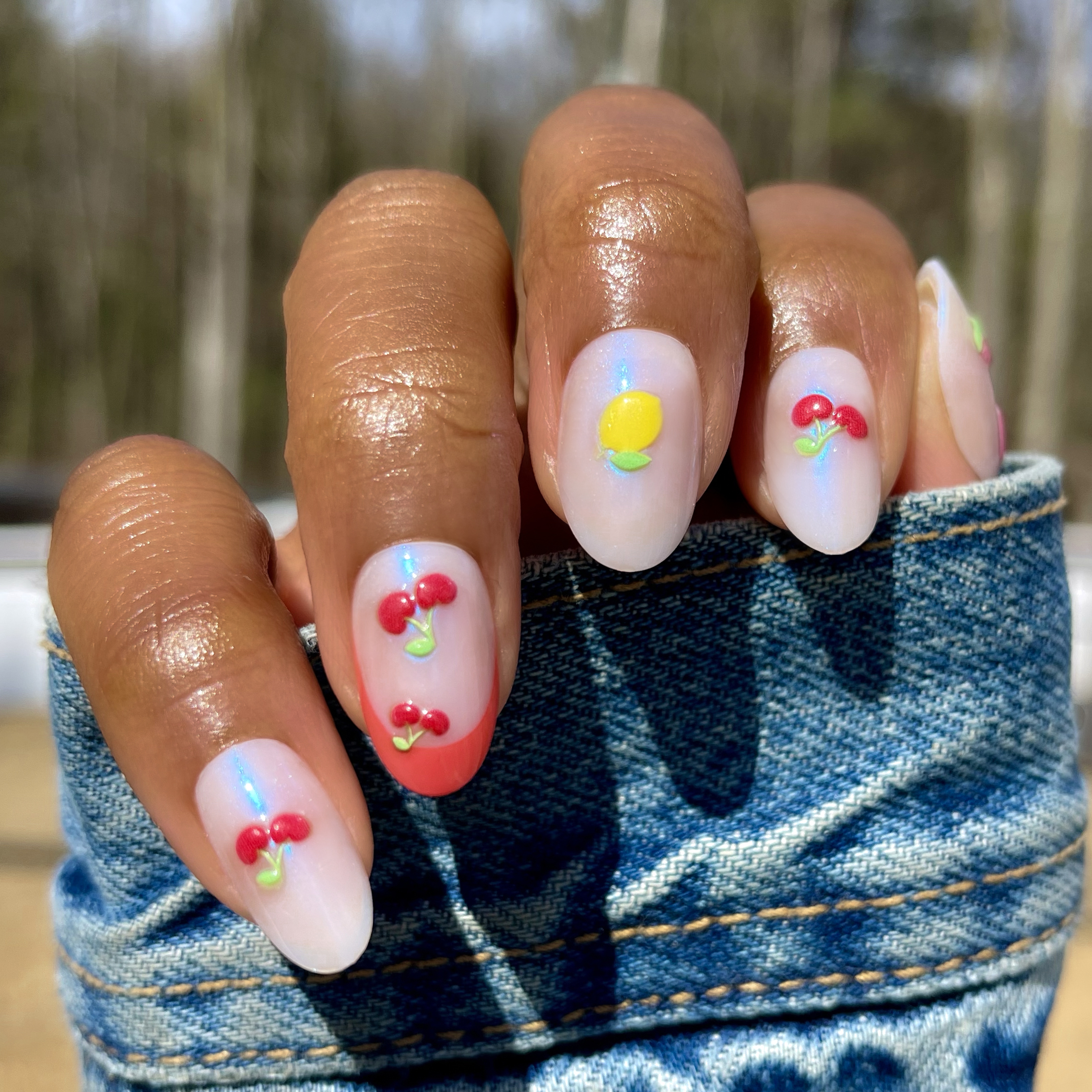 An iridescent mani with puffy 3D fruits in a medium oval shape.