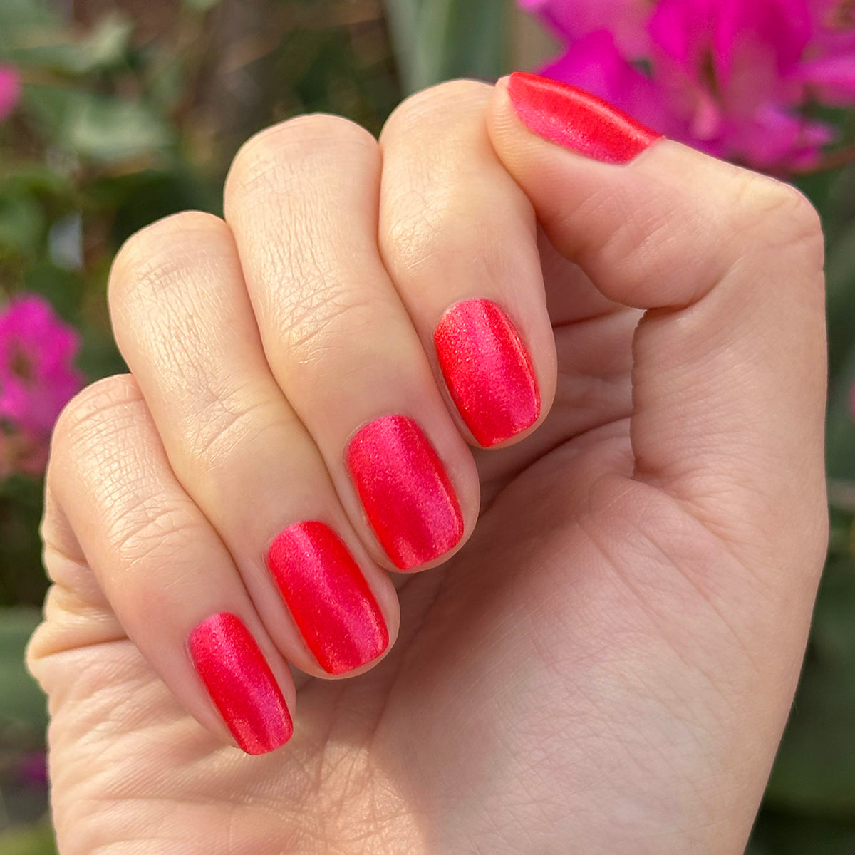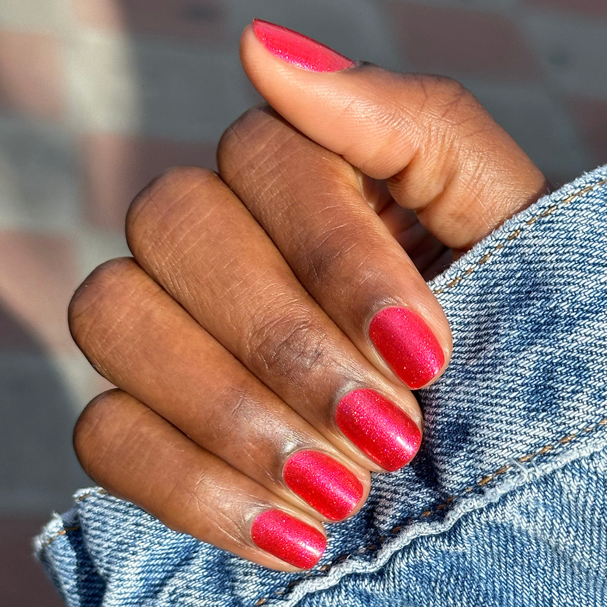 A bright pinky-red polish packed with silver shimmer that reigns supreme.