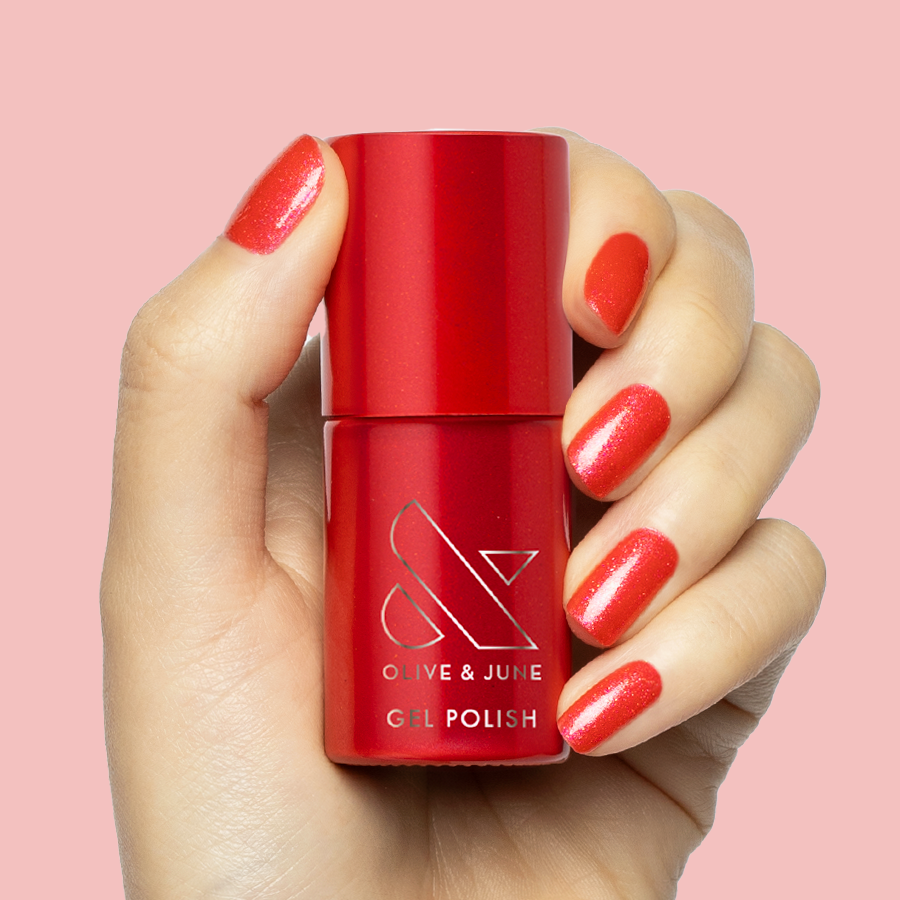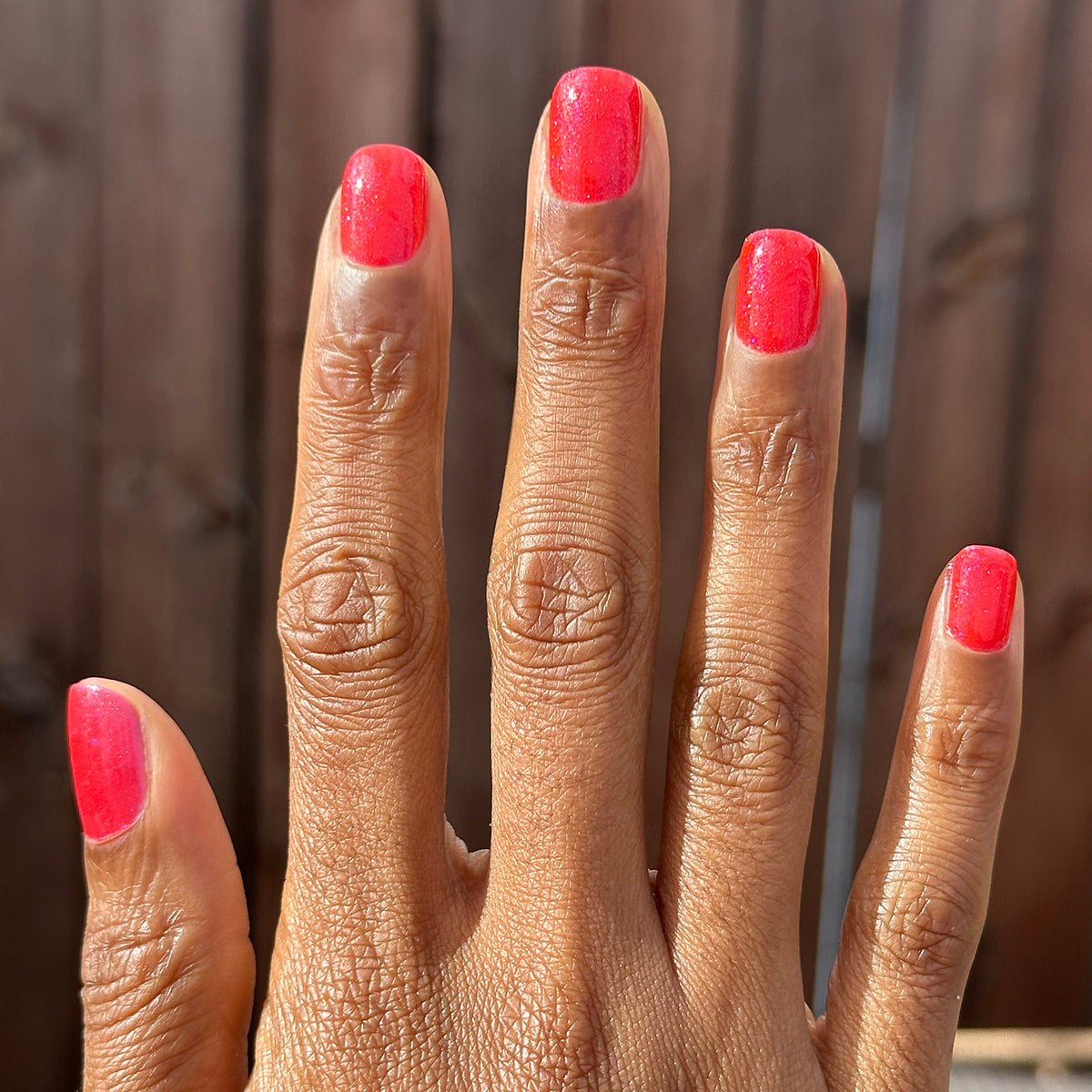 A bright pinky-red gel polish packed with silver shimmer that reigns supreme.
