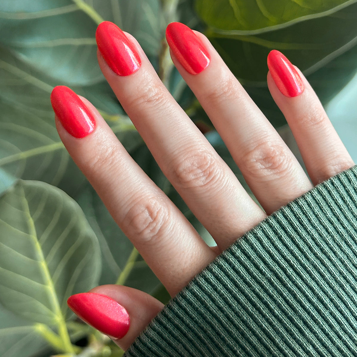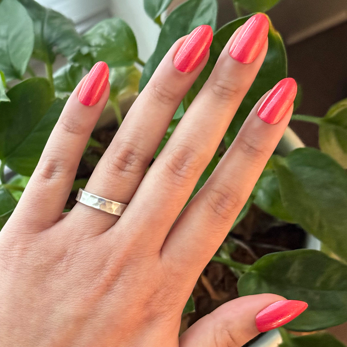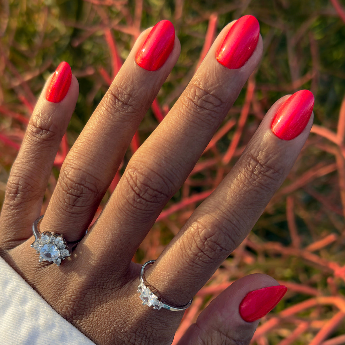 A bright pinky-red packed with silver shimmer in a medium oval shape.