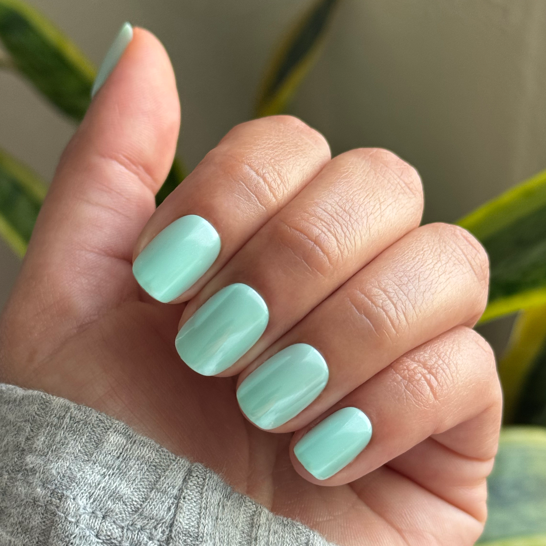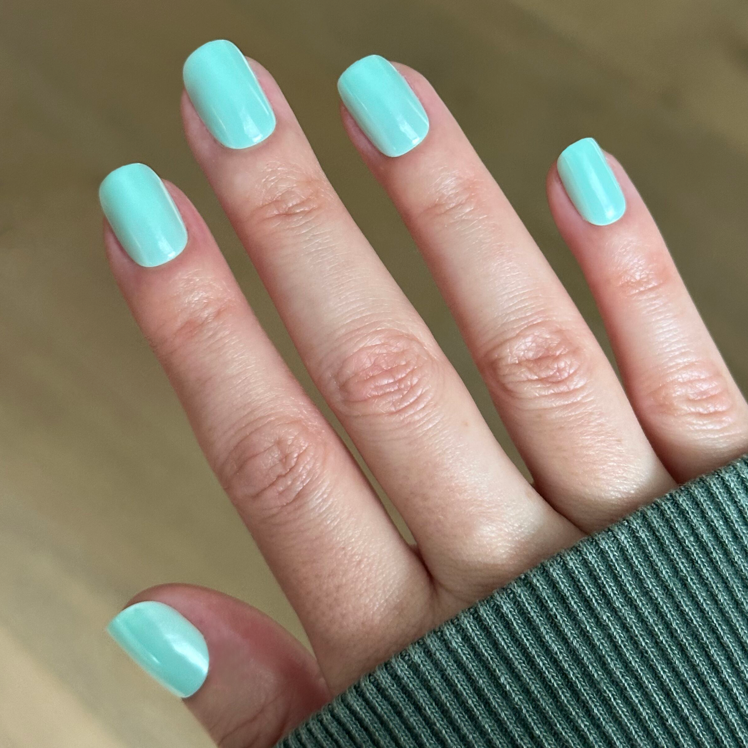 A bright turquoise mani topped with soft shimmery chrome in an extra short squoval shape.