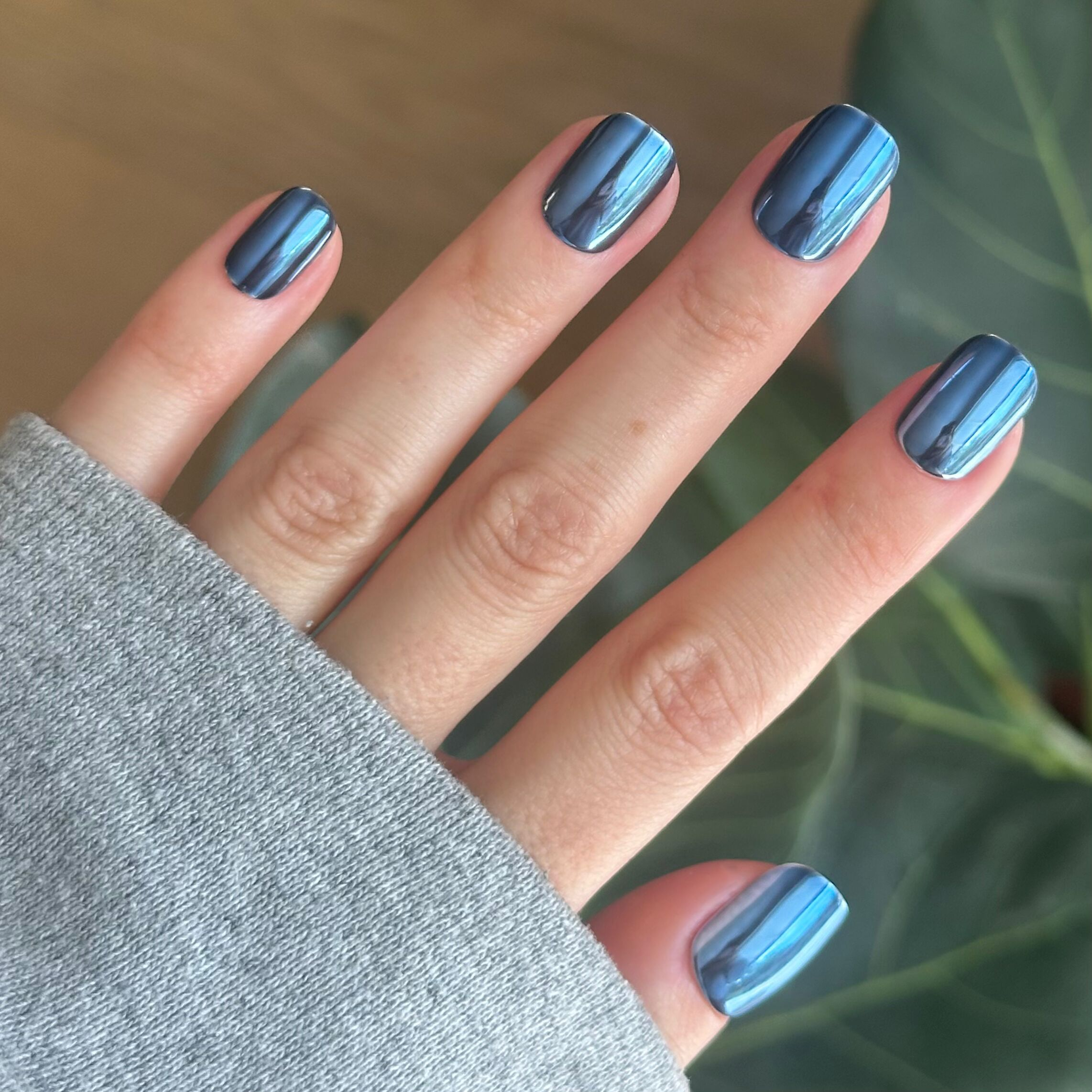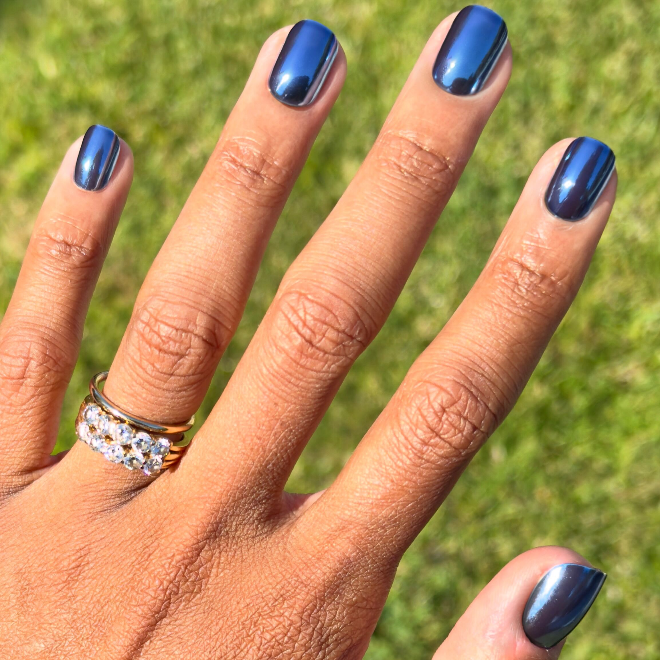 A deep midnight blue topped with a shimmery chrome effect in an extra short squoval shape.