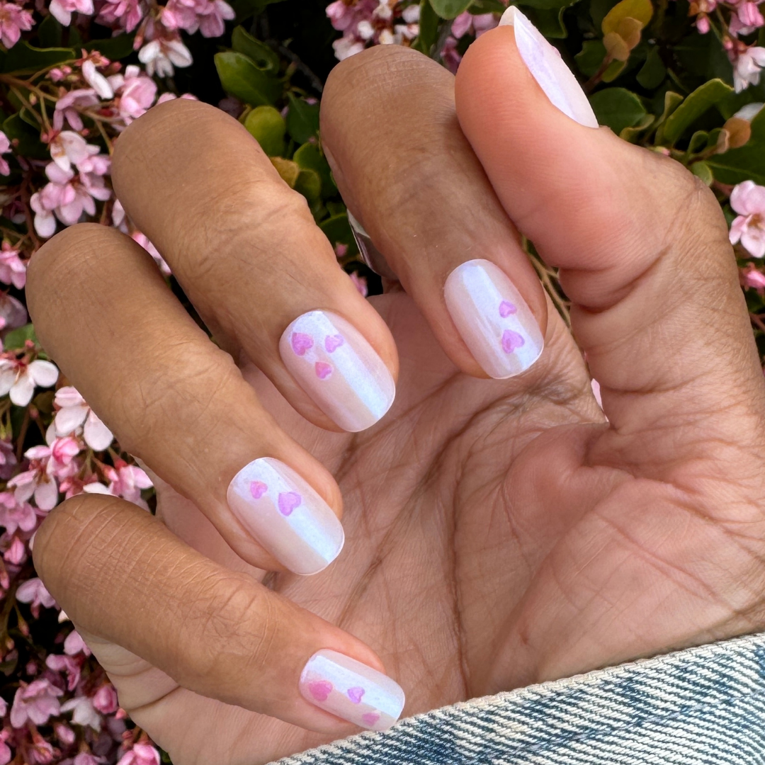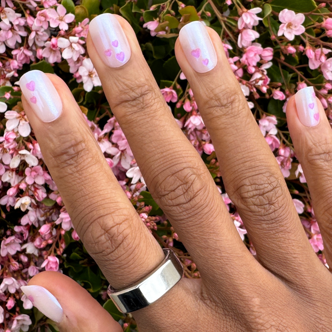 A shimmery iridescent base with puffy pink hearts in a short squoval shape.