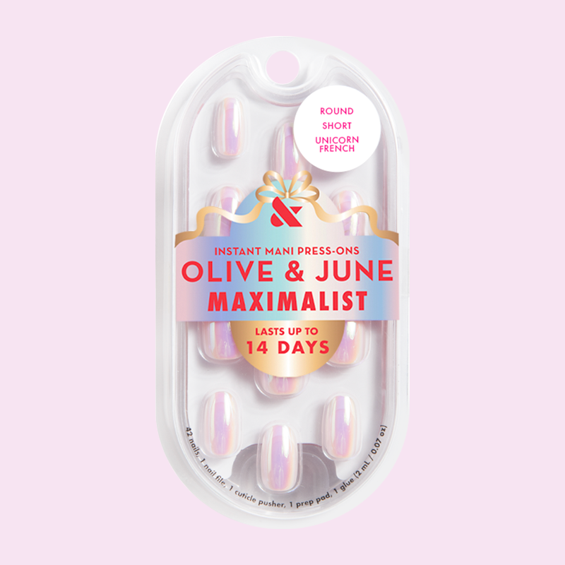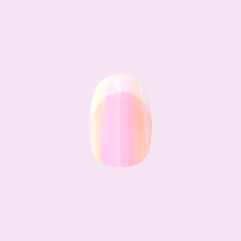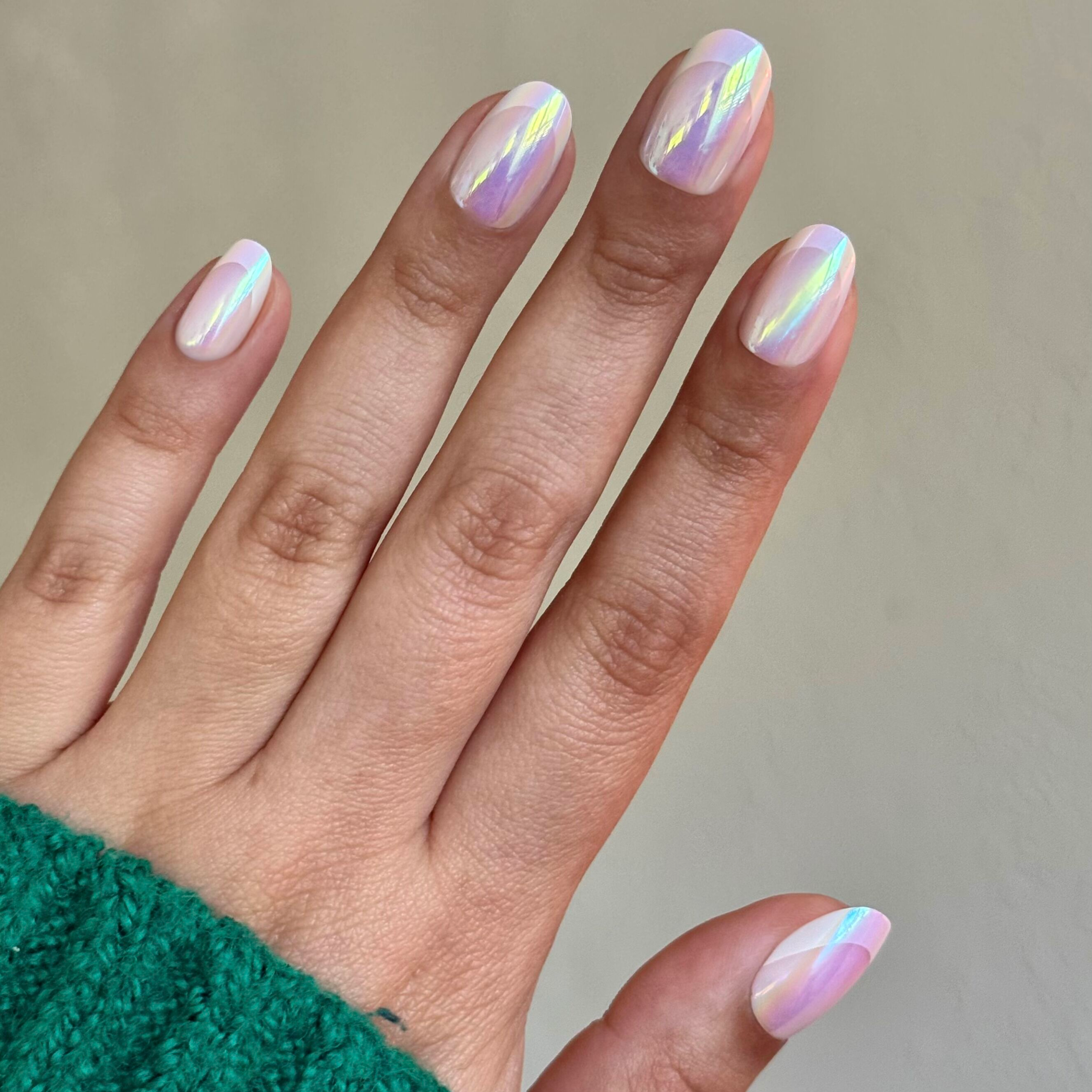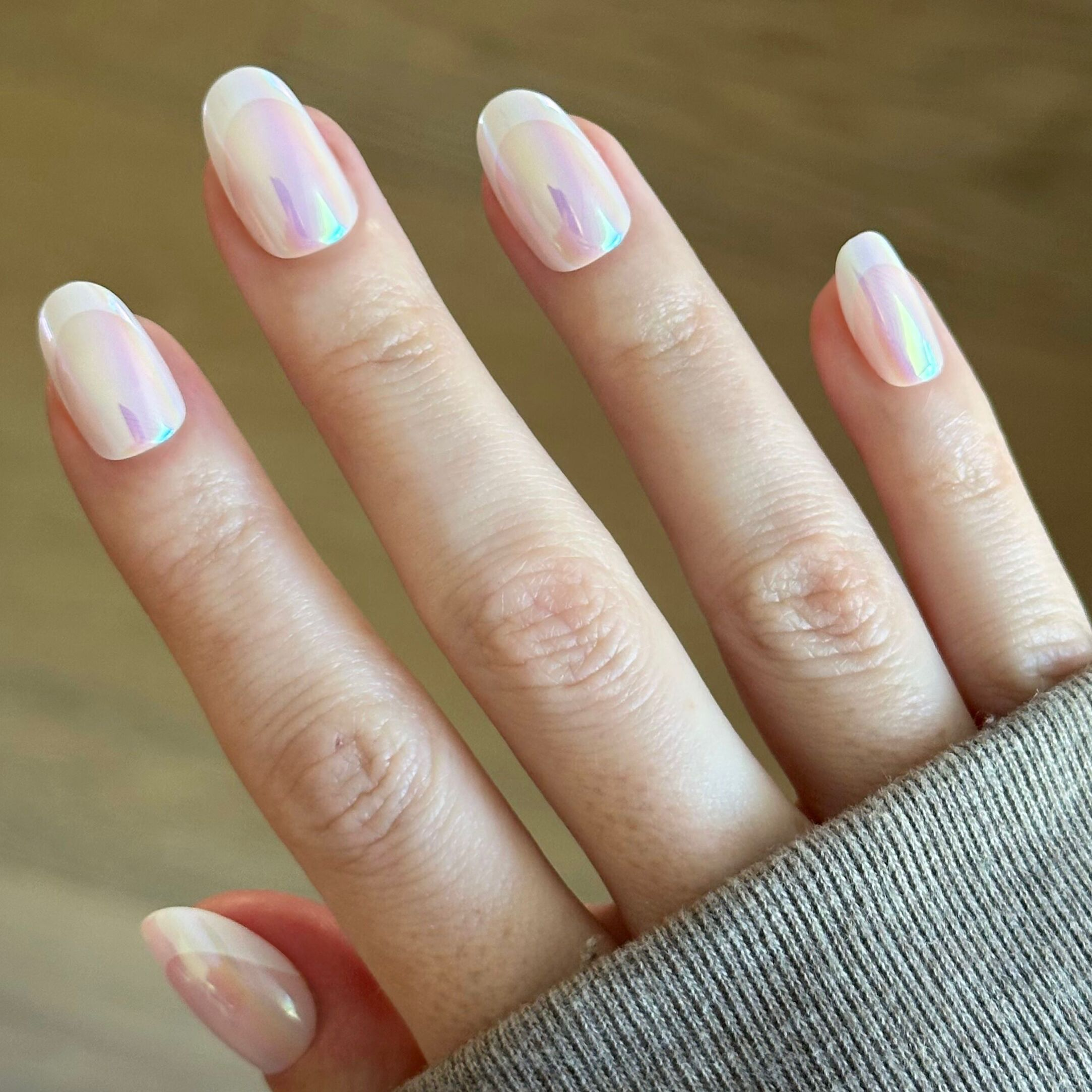 A classic french mani topped with a unicorn iridescent effect in a short round shape.